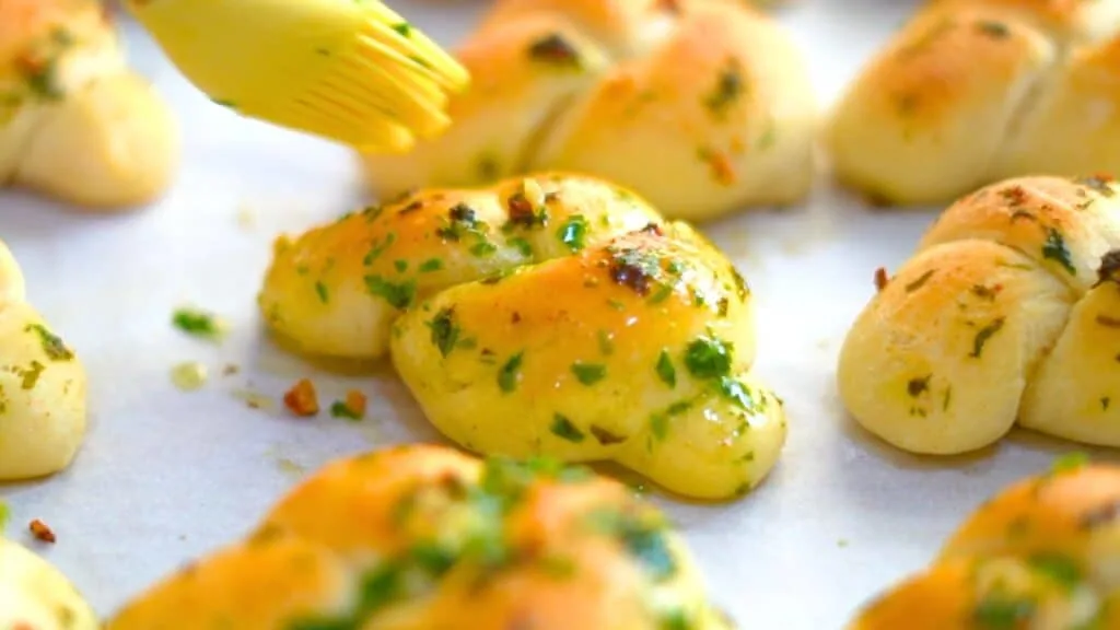 Brush the risen garlic knots generously with the prepared garlic butter topping.